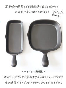火を使わず調理ができる。萬古焼のグリルパンが新登場!2024.4.11暑い夏にもぴったり!グリルに入れるだけでメインと副菜が同時に完成!一見、鉄板のように見えるこちらのグリルパン、実は萬古焼の陶器なんです。暑い夏にもに何かと役立つ大人気のグリルパンをご紹介いたします。暑くて直火を使いたくない夏にぴったり〜!○魚焼きグリルにポンといれるだけ!朝ご飯にも人気のおかず、お鮭のグリルを作ってみました。片面約5分づつ。オーブントースターでも作れます。パンを焼いている横でハムと目玉焼きなんかもできちゃいます♪(機種によって異なりますので焼き加減を見ながら作ってみてください)○洗い物も少なく、片付けの時間まで短縮できます!本来ならフライパンにお鍋に食器、、と洗い物が溜まってしまう お料理も、このおしゃれなグリルパンならそのまま食卓に出せるので 洗い物がこれひとつで完結します。 見た目が重厚なので重く見えるのですが、 陶器なので軽く、サイズもコンパクトなので通常のお皿のように洗って収納いただけます。 ご家族分揃えても重ねて収納できるのが嬉しいポイントです。○サイズは通常サイズとハーフサイズの2種類。用途に合わせてサイズを変えても◎ 通常サイズではフレンチトーストなどにも対応できる大きさ。 シェアしたいとき、たっぷりいただきたいときには通常サイズもおすすめです。 ハーフサイズはお一人様分の大きさです。(魚の切り身1つ分+副菜等)○萬古焼ならではのふっくら感。三重県四日市市で作られている萬古焼。土鍋の産地としても知られています。 萬古焼が得意とする土鍋の機能でもある熱伝導を一気に高めながら、 遠赤外線効果でふわっとした食感と旨味をひきたてます。○調理スペースが確保できます。朝食にお弁当にと慌ただしい朝にも、コンロではなく魚焼きグリルを使うことで 調理スペースに余裕ができ、もう一品つくれちゃいます! 空いたスペースで卵焼きなども作れて時短にも役立ちます。 もちろん、電子レンジにも対応しているので温め直しも対応できます。暑い夏のお料理を涼しく、ラクに。 人気のグリルパンを是非お試しください!商品の詳細はこちらから
