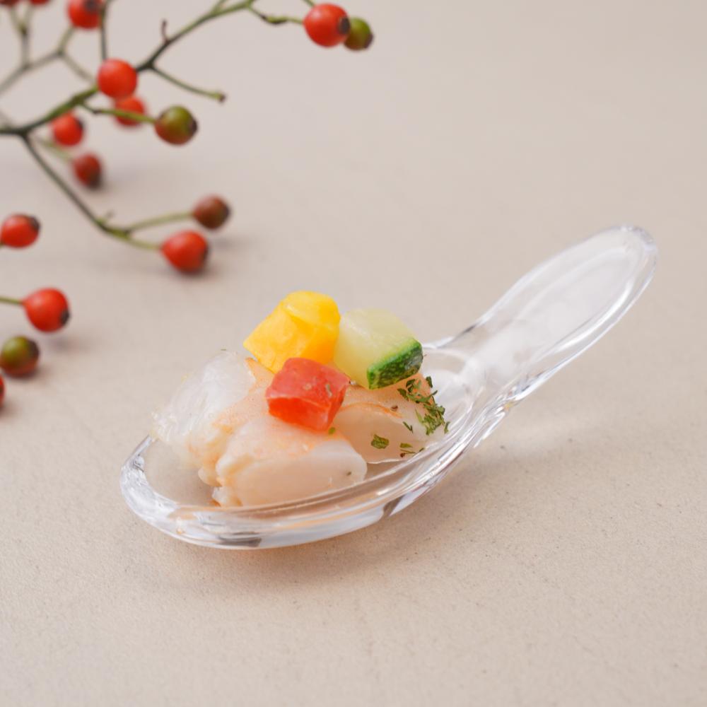 透明感あふれるレンゲ型のガラス珍味入れ。