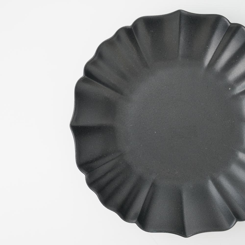花びらのようなやわらかなかたちに、静かに佇む墨色のお皿。