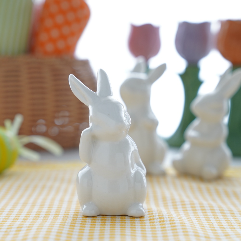 耳を澄ますように立つ子、腕を組んでお空を見上げる子、少しおすまし顔の子、それぞれの表情が愛らしい磁器のうさぎたち。