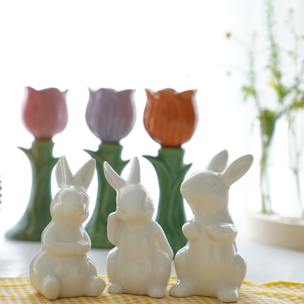 3体を並べると小さな物語が生まれ、イースターやお月見のしつらえはもちろん、日々のインテリアにも華やぎを添えてくれます。