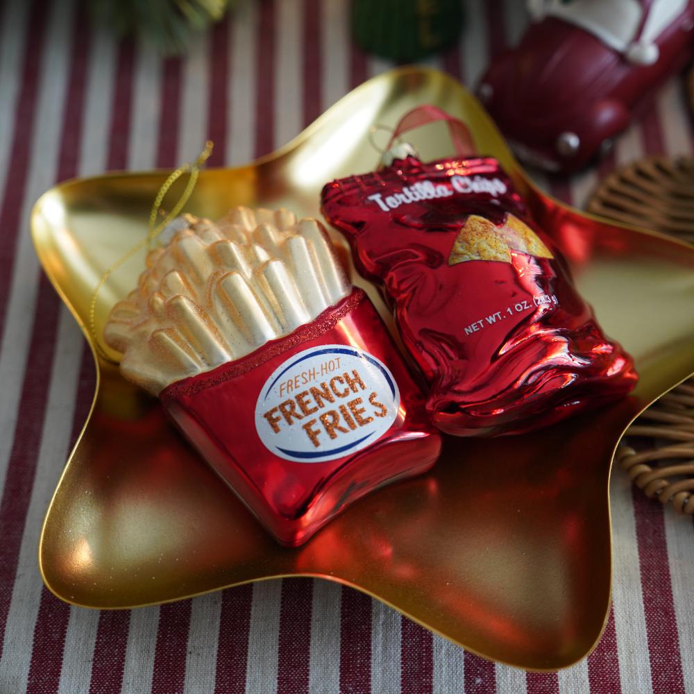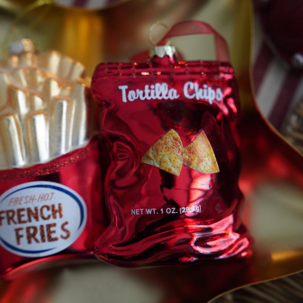 ユーモアが光る 真っ赤なチップスオーナメント クリスマスのデコレーションに遊び心をプラスする、トルティーヤチップスの袋をモチーフにしたユニークなオーナメントです。 真っ赤な袋のリアルなデザインは、ツリーに飾ると目を引くアクセントになります。 パーティーのテーブルでもゲストを楽しませてくれるアイテム。 ツリー全体にユニークなストーリーが生まれます。 パーティー好きな方への、遊び心あるギフトとしてもおすすめです。