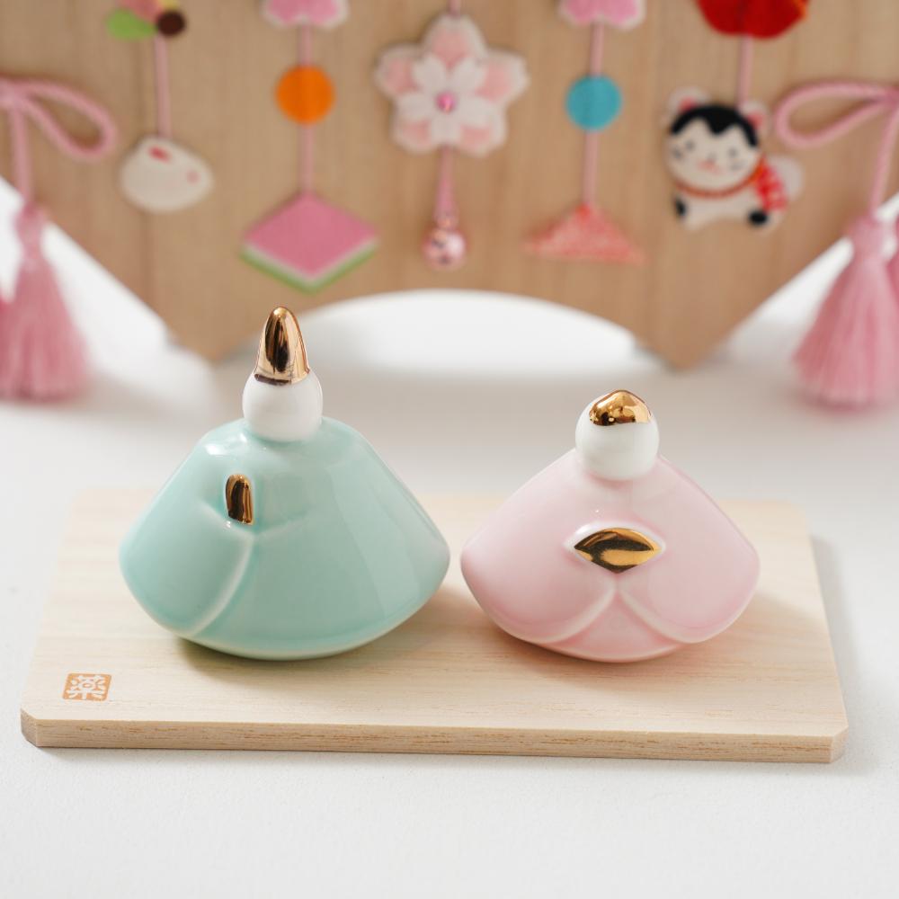 淡くやさしい色合いが印象的な、瀬戸焼の雛飾りです。