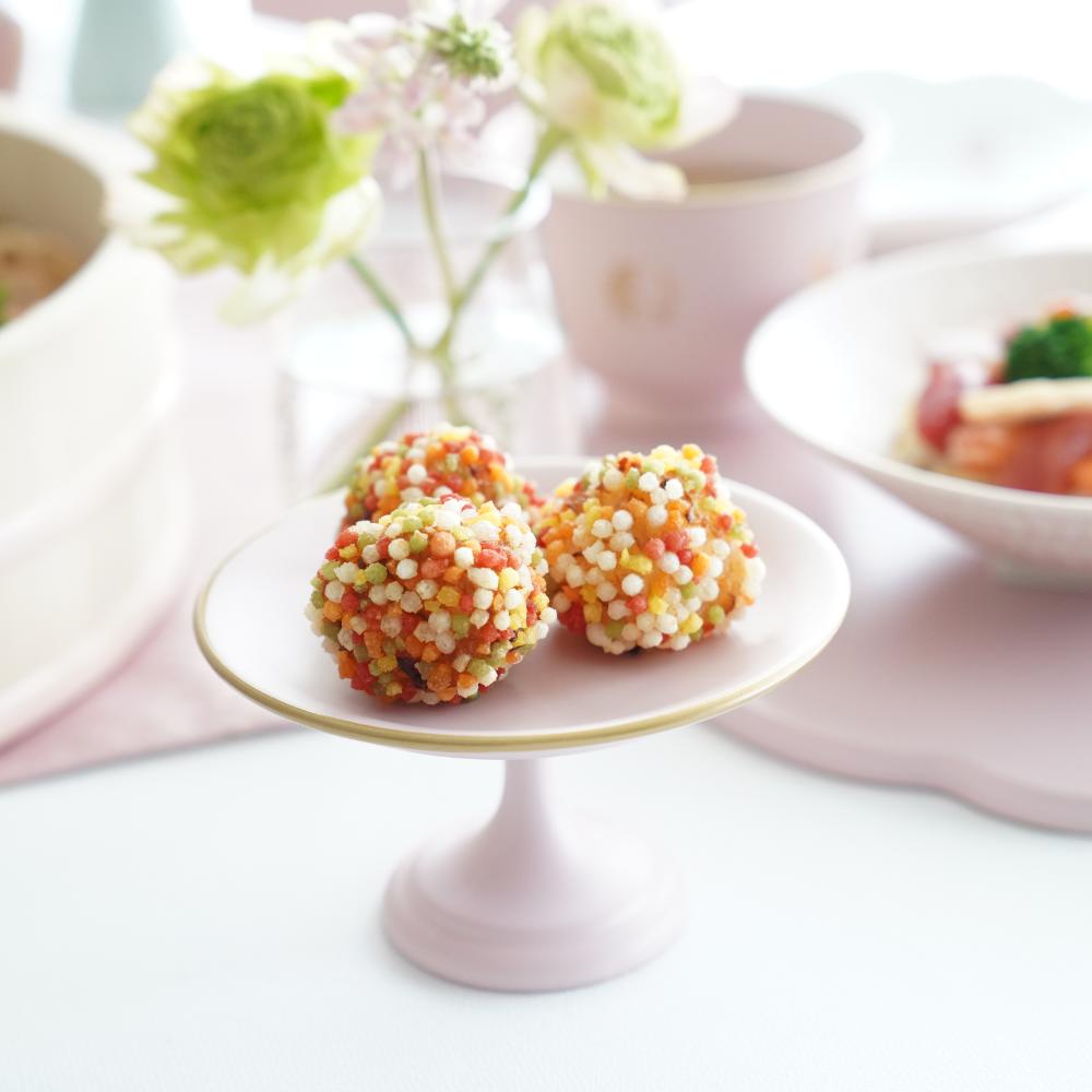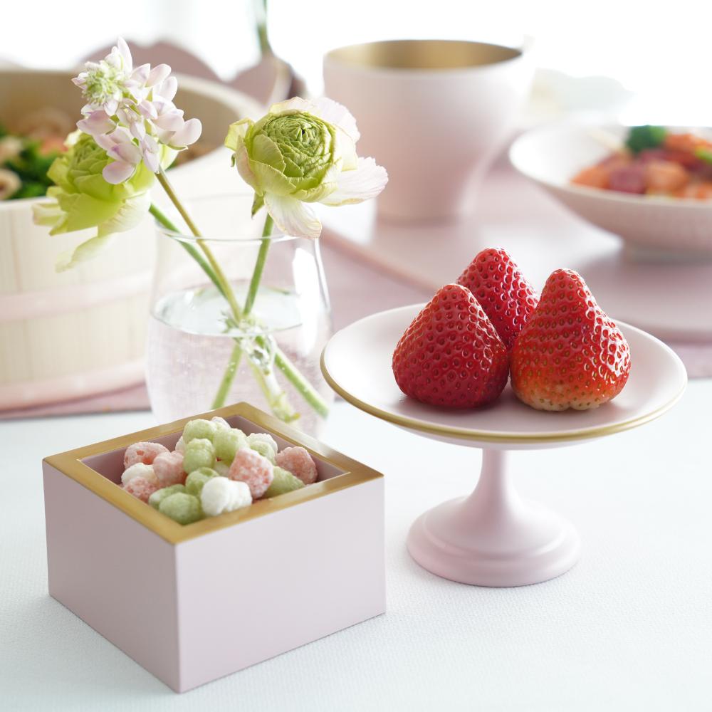 ▲雛祭りにもぴったり!可愛らしい菓子をのせて、コーディネートのポイントに。