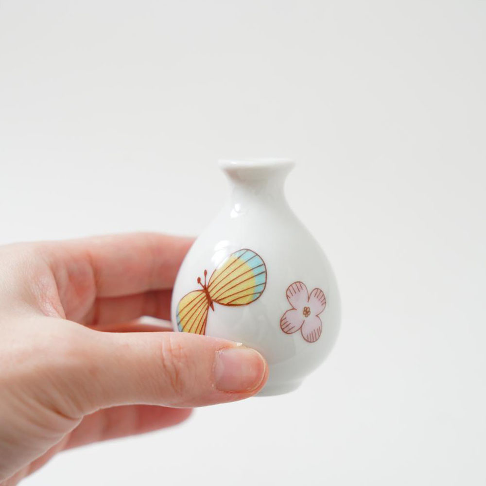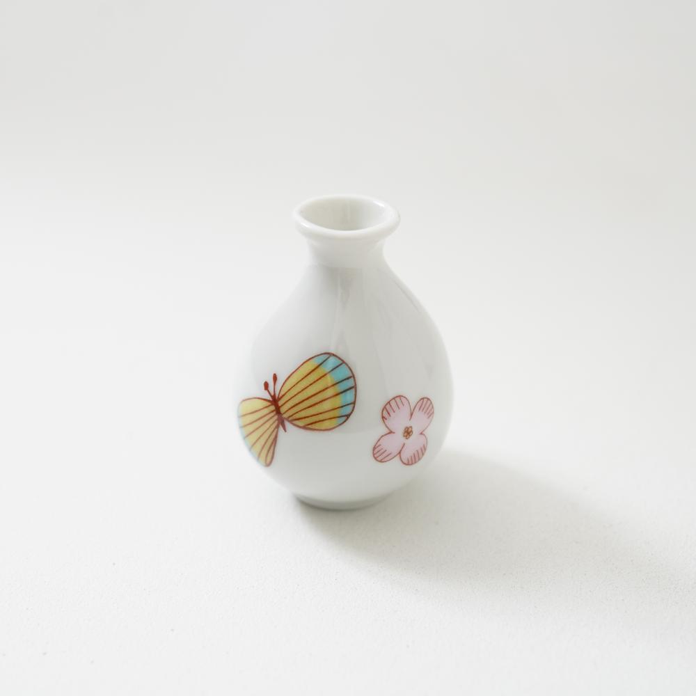 可愛らしい色合いで描かれた、蝶と花の絵柄が印象的な九谷焼の一輪挿しです。