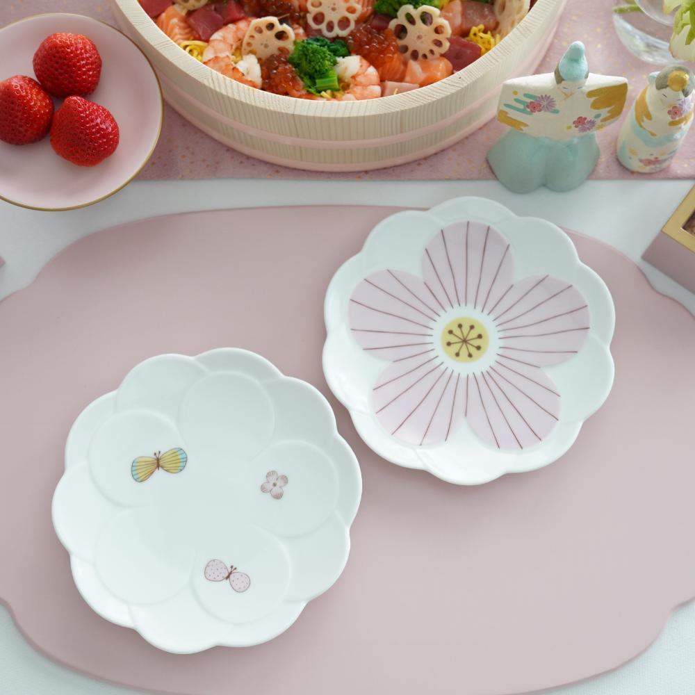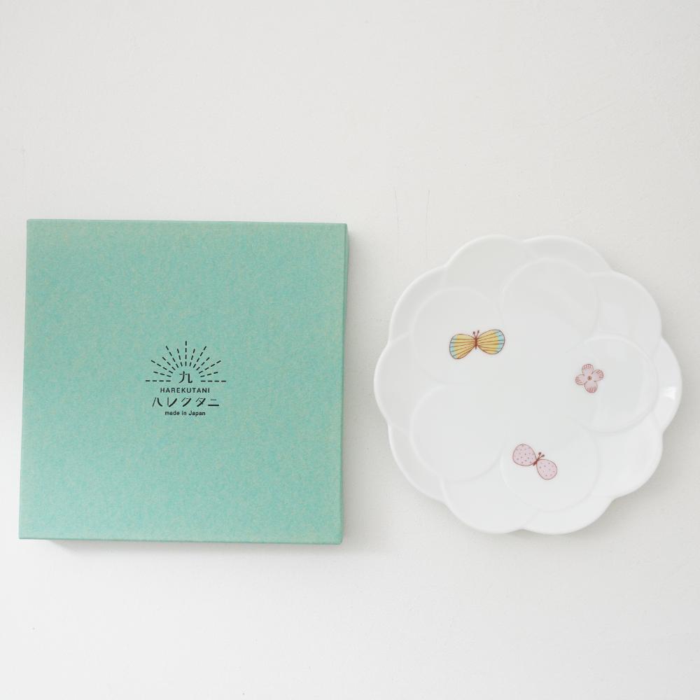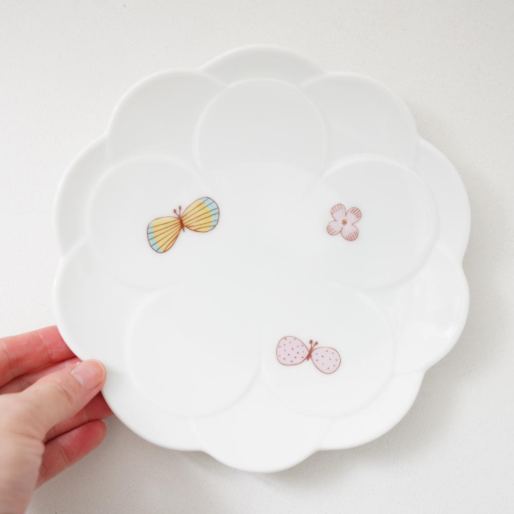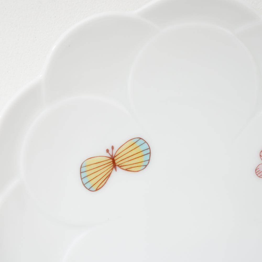 チョウとお花をポイントにあしらった、九谷焼の中皿です。