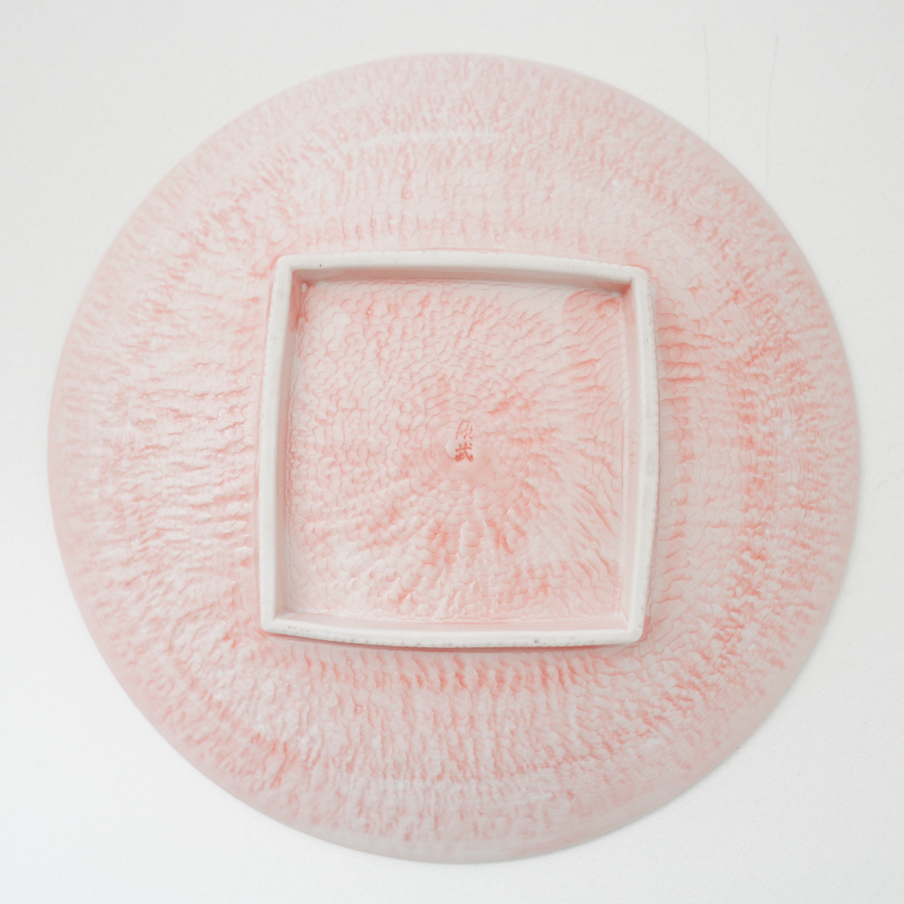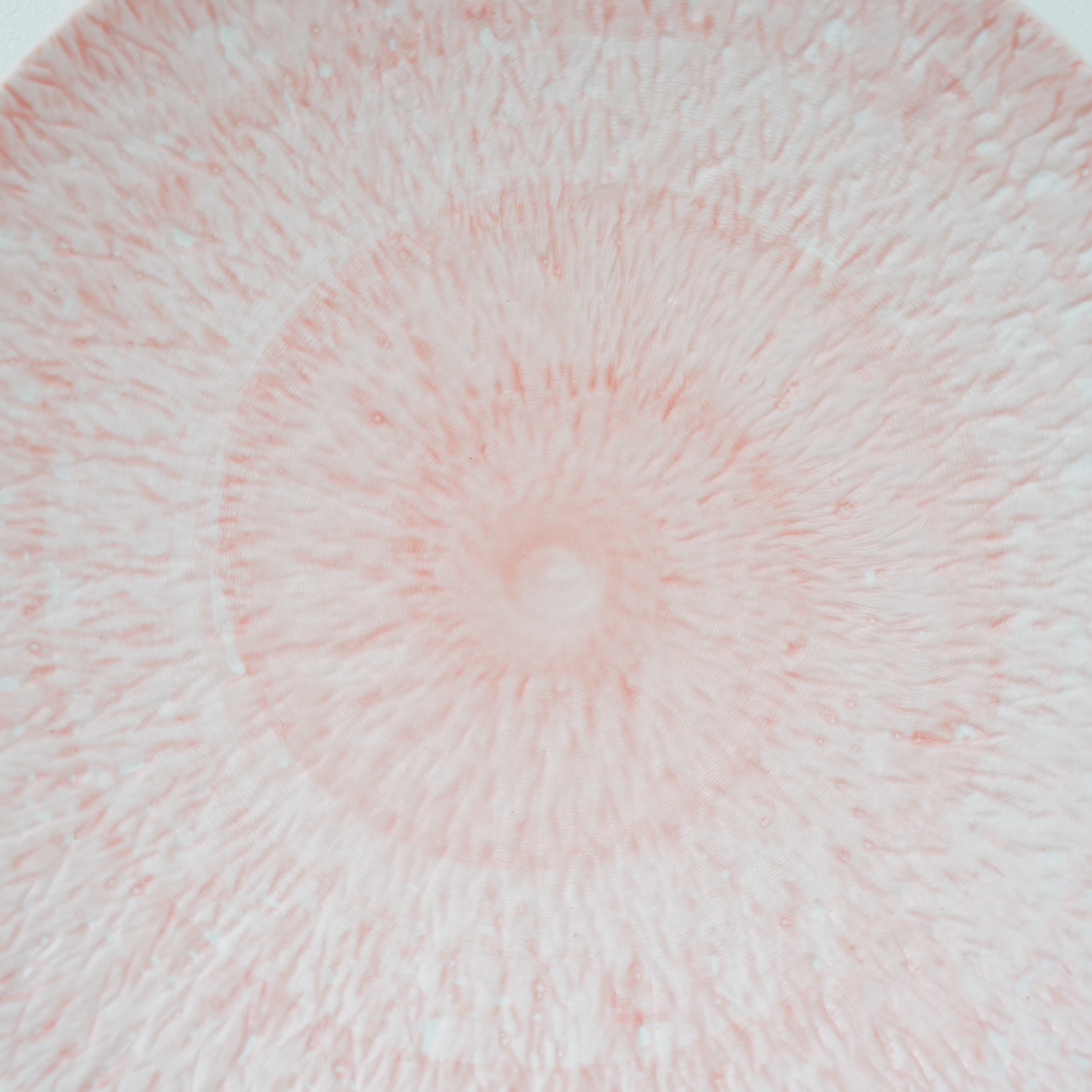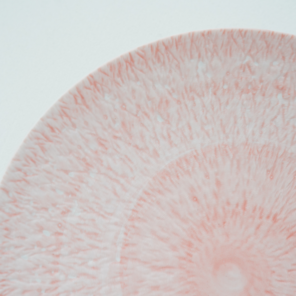 とちり模様の美しいコントラストが印象的な、とちりピンク丸皿。