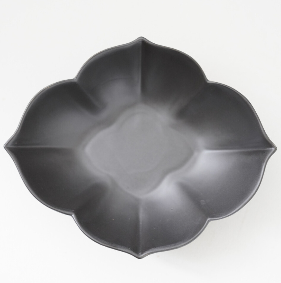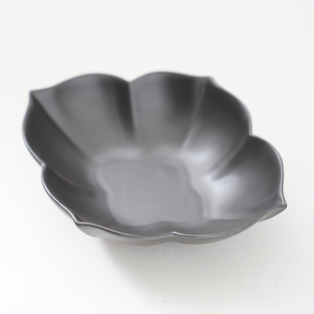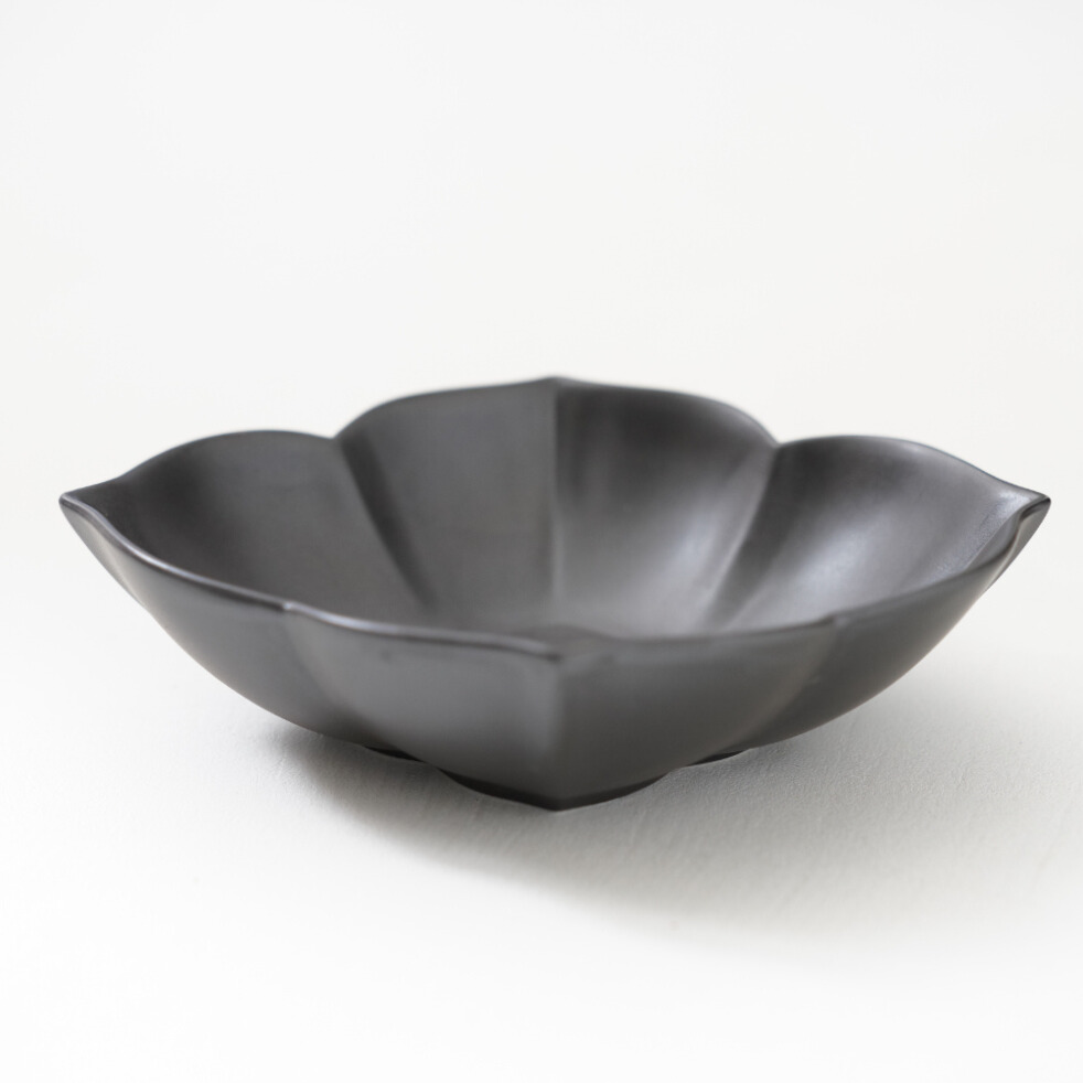 落ち着いた黒マットの質感に、花を思わせる木甲型のフォルムが映える波佐見焼の中鉢。